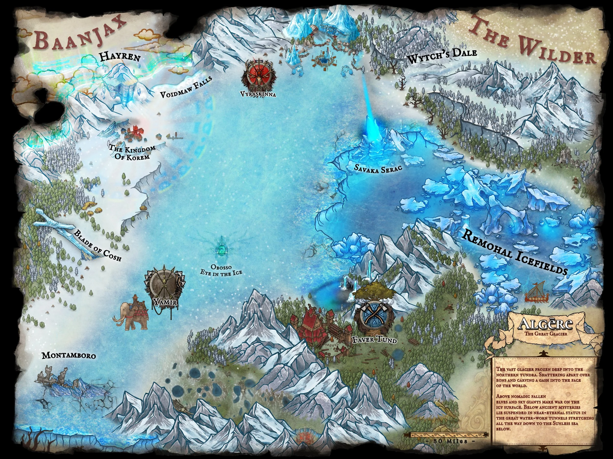 The largest settlement in all of Algēre, Vyraskinna is the heart of the Vyraskim people. They are a culture composed largely of blooded riven, founded on the practice of Vyrask, or The Fettering, a form of dark magic. The settlement itself is an icy sprawl of tents, yurts, and temporary structures, forming a vast network of winding streets and roadways like a city-sized encampment. At its center lies a massive pit, plunging into the darkness of the inner glacier. The Vyraskim believe that by meditating at the pit’s rim, they can hear echoes from below, the whispers of Kaika, the greatest Vyraskim fetterer to have ever lived. They claim Kaika transcended mortality, descending into the glacier where only those like him can walk among the spirits dwelling within. His followers believe that the echoed mantras from below guide them toward the same path of enlightenment, shaping the very foundation of Vyraskinna’s culture.