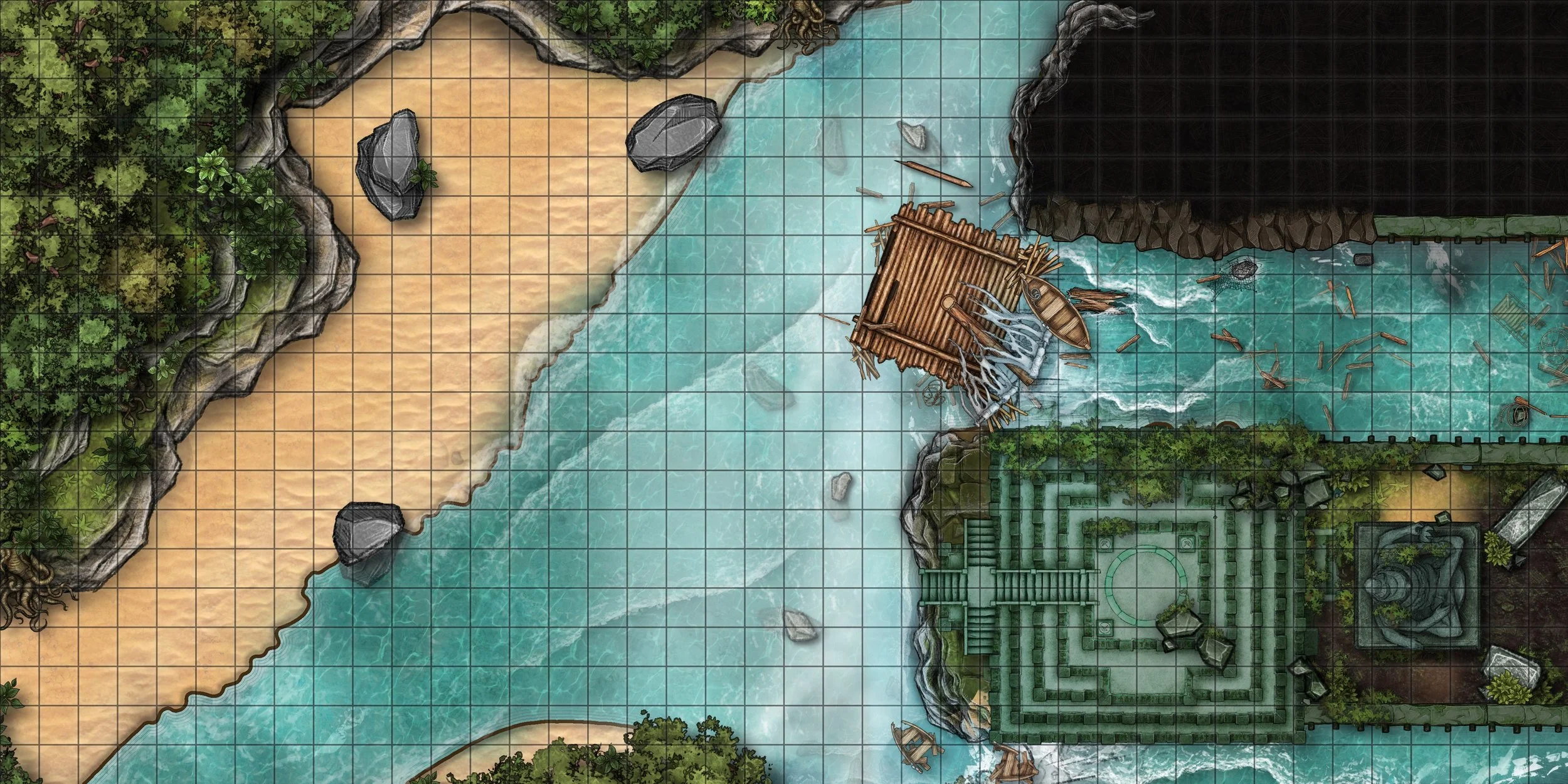 Adventurers top a ramshackle raft as they are pulled at a violent clip down stream. The map this time moves around the players. the raft itself the focal point so tokens don't need to be moved between phases.